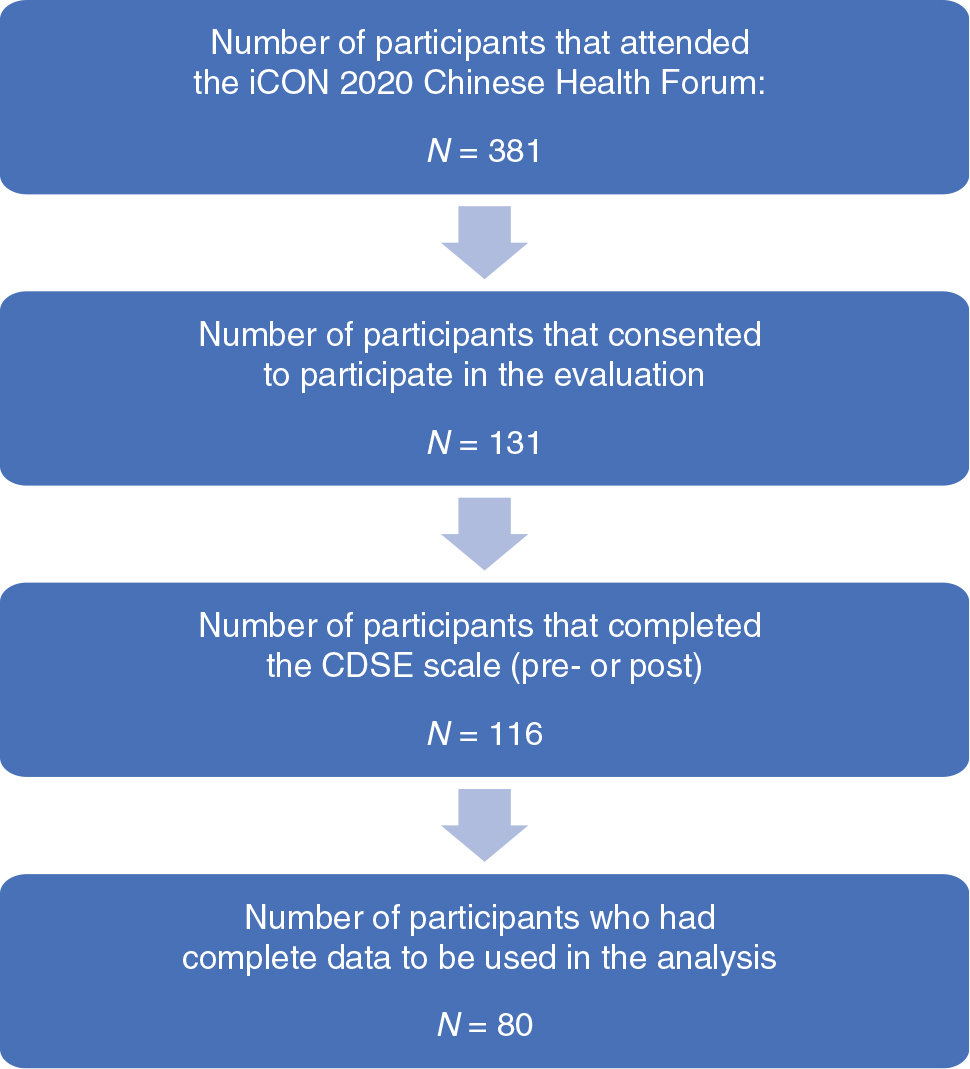 Table 2 shows characteristics of participants who attended the iCON 2020 Chinese Health Forum. Of the N = 381 participants that attended the forum, either in-person or remotely, n = 131 consented to participating in the evaluation. From them, n = 116 completed the CDSE scale survey (Fig. 1).