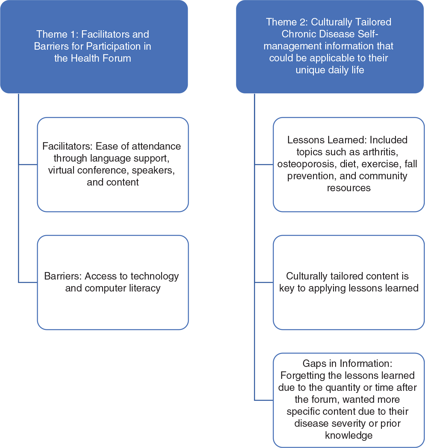 Lessons learned. Interview participants expressed that the chronic disease self-management information they learned was applicable to their daily life. Lessons learned at the forum included information on arthritis, osteoporosis, diet, exercise, fall prevention, and community resources. Key to facilitating participants uptake of lessons learned was the culturally tailored content provided in their language, also discussed in participation facilitators and barriers (Theme 1).