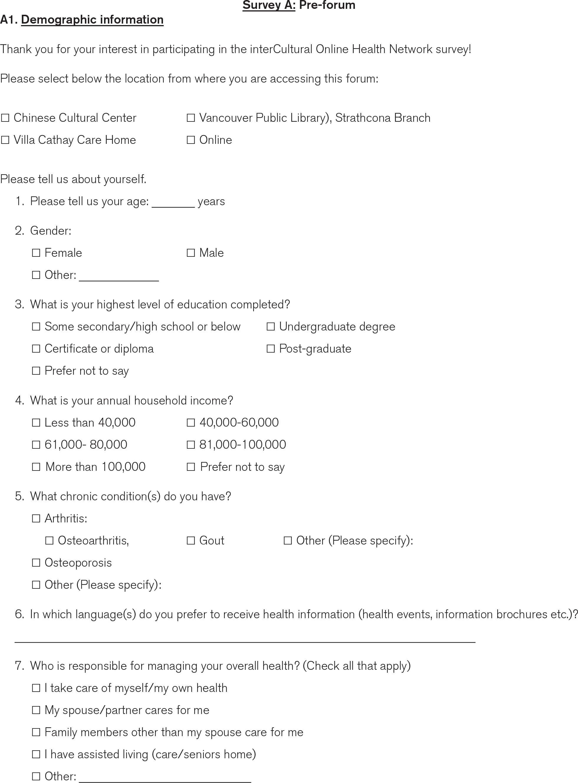 We ensured that all participants received a welcome package upon entry to the forum which consisted of an English or a Traditional Chinese translated version of the pre-forum (Appendix B, Part A) and post-forum (Appendix C, Part B) surveys and consent form. The pre-forum survey included demographic questions (i.e. age, gender, education level, household income, chronic conditions, language preference, self-management of health, general health status, current health/mobility issues, and social isolation level) in addition to the CDSE scale, while the post-forum survey only included the CDSE scale. For those that attended the forum online, we provided an English and Traditional Chinese translated REDCAP survey option that they were prompted to complete at the start of the forum and after the final talk.