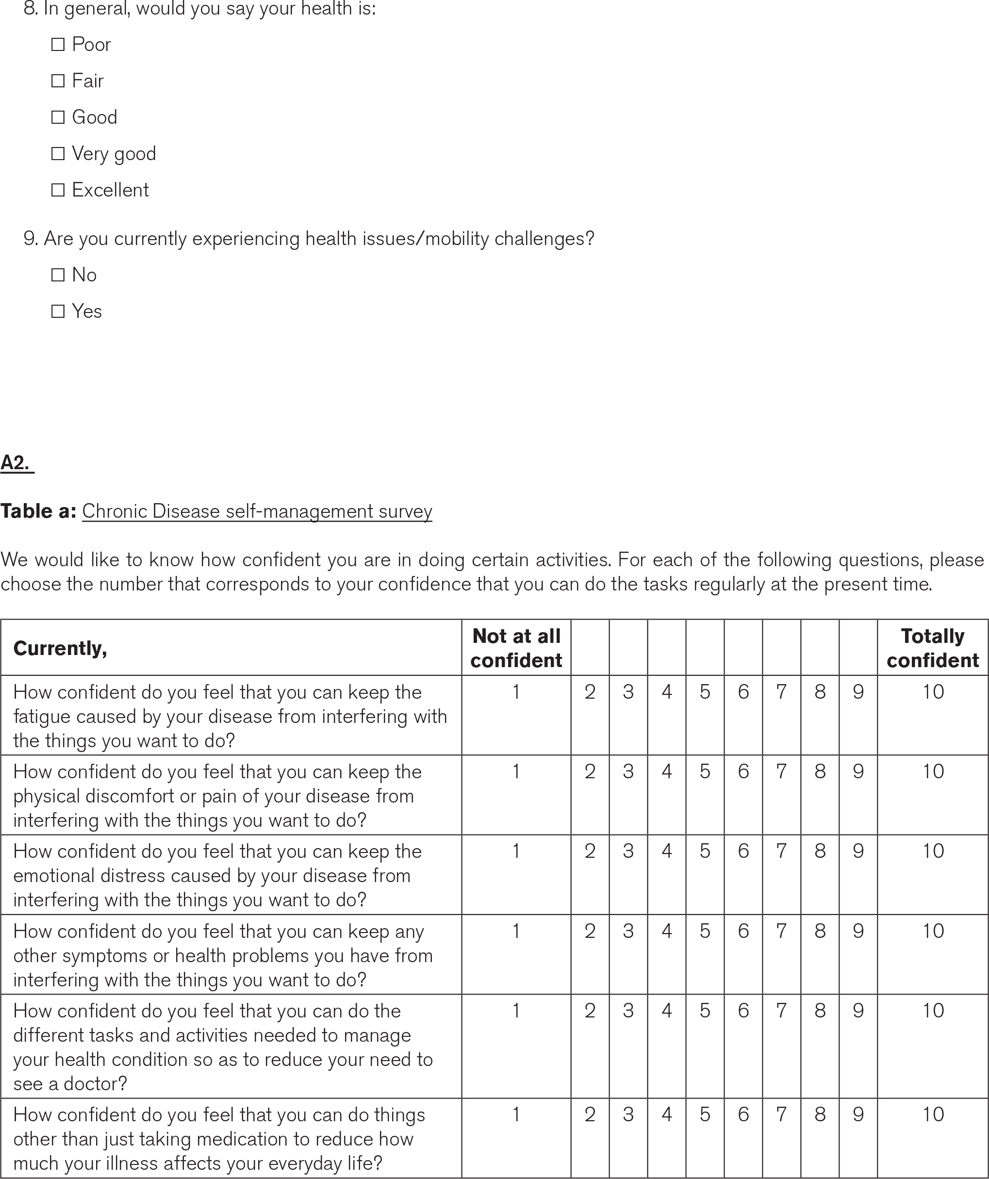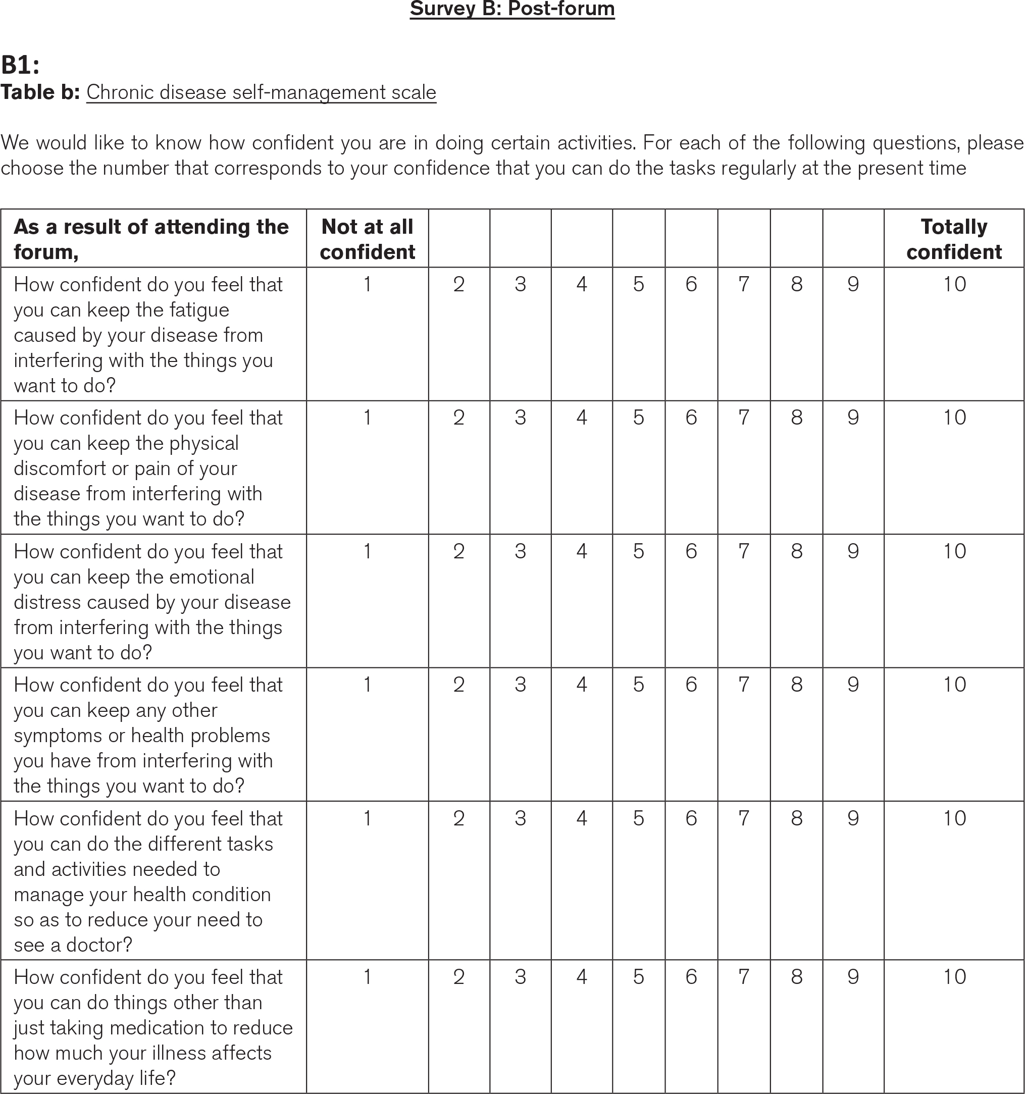 Chronic disease self-efficacy. To answer our primary research question of whether there is a difference in knowledge and understanding of self-efficacy as a result of the forum, we administered a validated Chronic Disease Self-efficacy (CDSE) scale36 in the pre- and post-forum survey, which has also been tested in the Chinese population.37 The six-item CDSE scale is a shortened version of several other CDSE scales and has been cited as less cumbersome for participants.36 The scale aims to assess the participant’s confidence in being able to navigate symptom control, role function, emotional functioning, and healthcare professional reliance that is consistent across chronic diseases.36 It is scored on a Likert scale of 1 to 10, with 1 being ‘not at all confident’ and 10 being ‘totally confident’. The total score for the scale is represented by the mean of the six items, with a high number indicating high self-efficacy.