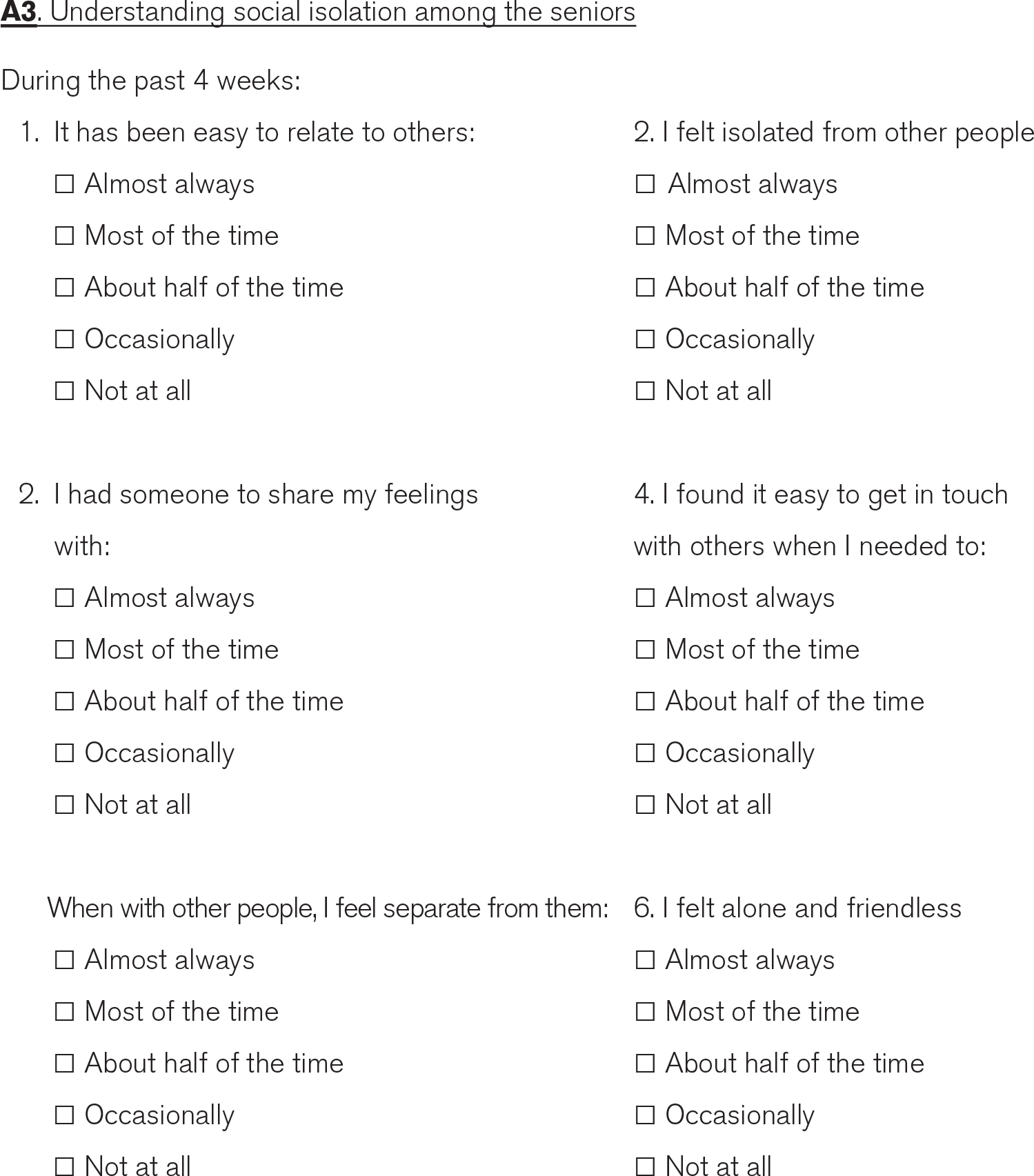 Social isolation scale. We also administered a social isolation level questionnaire, called the Friendship scale,38 as part of the pre-forum survey (Appendix C, A3) to further understand the demographic of the participants attending the forum and since feelings of isolation and depression have been shown to moderate the effects of interventions on self-efficacy.39 This short five-item scale aims to capture different aspects of isolation including but not limited to personal intimacy, loneliness, getting along with others, accessing support when needed, and being dependent. The Friendship scale uses 5-point Guttman-type responses, with every question requiring a response of either ‘almost always’, ‘most of the time’, ‘about half of the time’, ‘occasionally’, or ‘not at all’. Each of these options is given a number from 0 to 4, depending on the question type.38 The total score for the scale can be calculated by simply summing up the value of each option for every question, with the total ranging from 0 to 24. A high score on the Friendship scale (range 20–24) indicates high social connections.