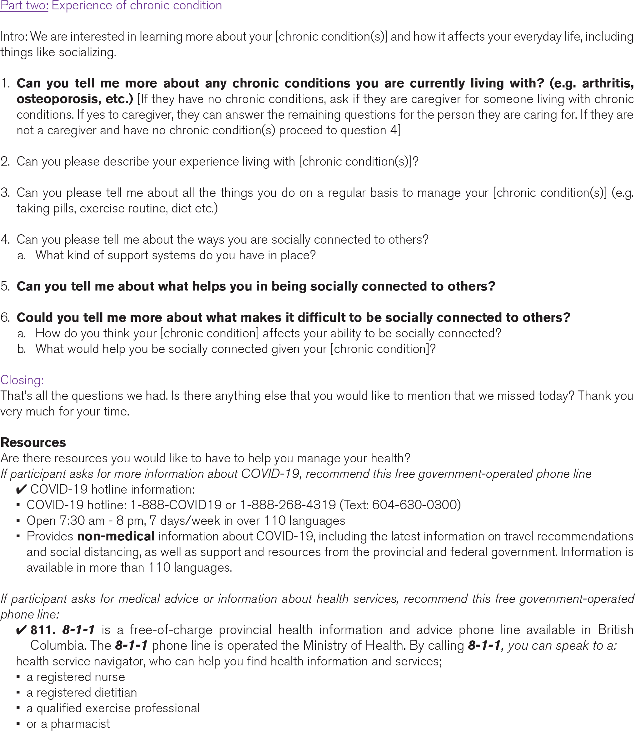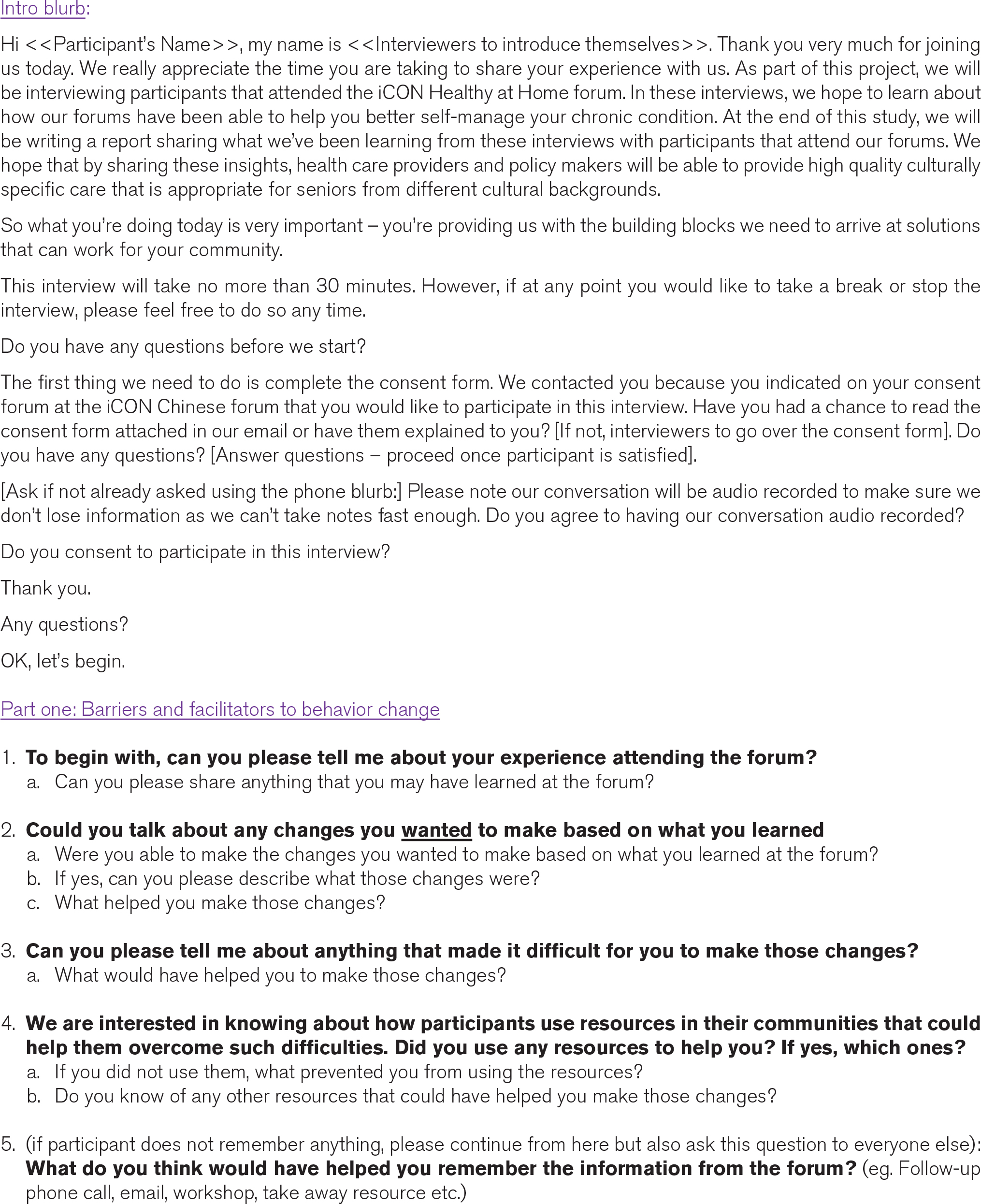 We conducted semi-structured interviews with forum participants 1–2 months after the forum to further illuminate our main research question: how the iCON 2020 Chinese Health Forum can improve the knowledge and understanding of chronic disease self-management in the Chinese community of Vancouver, BC. Interview questions explored participant’s overall forum experience, barriers and facilitators to behavior change and as applicable, their experience living with their chronic condition(s). (See Appendix D for Interview Guide). Participants were given the option to leave their contact information on their consent forms to participate in this follow-up interview. The interviews were conducted by phone call in Cantonese and audio recorded by our team members who are fluent in Cantonese and English.